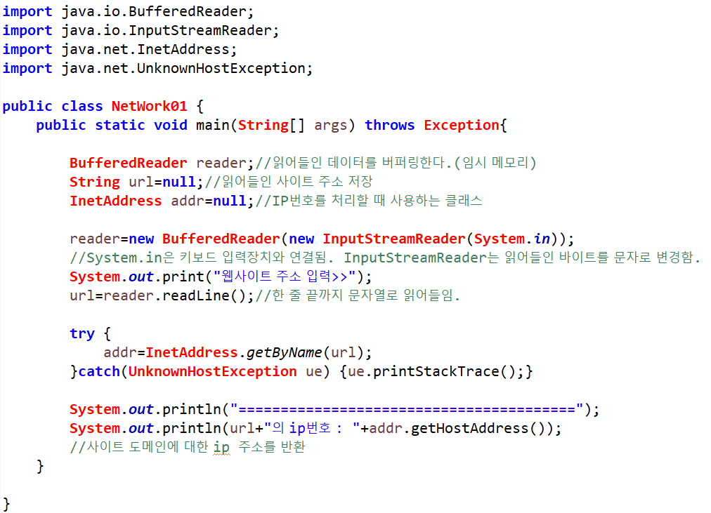 자바에서 IP주소를 다루기 위한 클래스로 InetAddress를 제공하며 아래와 같은 메소드가 정의되어 있다.
