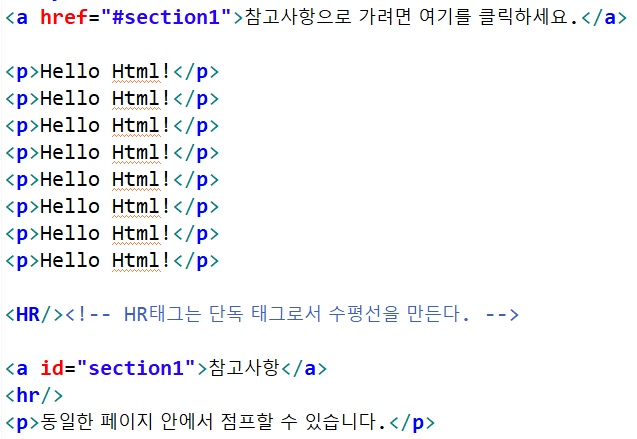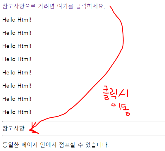href="이동할 주소 또는 파일명" (지정한 주소로 이동) or a에 id값을 주고 href="#아이디값"으로 해당 id값의 a로 이동