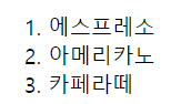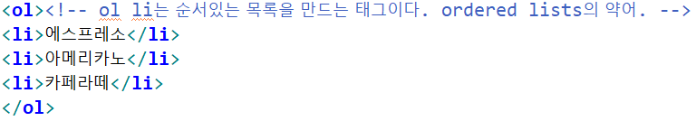 ol태그는 부모태그, li태그는 자식태그로 부모는 반드시 자식을, 자식은 반드시 부모태그를 갖고있다. 여기서 ol li태그는 순서있는 목록을 만드는 태그이다. ol은 ordered list의 약어이다.