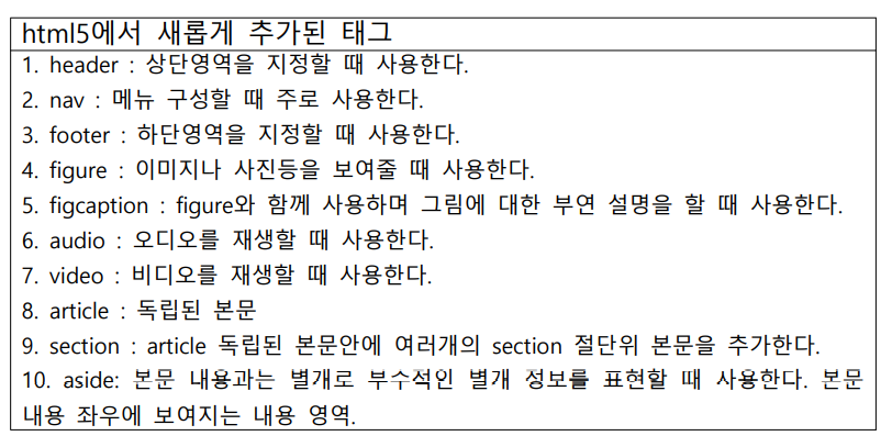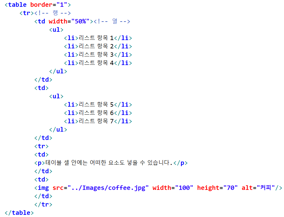 <tr></tr> : 행 / <th></th> or <td></td> : 열 / <caption></caption> : 표테이블 제목 지정 시 사용