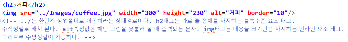 src="그림 파일 경로와 파일명" (지정한 경로의 파일 삽입) ../ 는 한단계 상위폴더로 이동(상대경로)