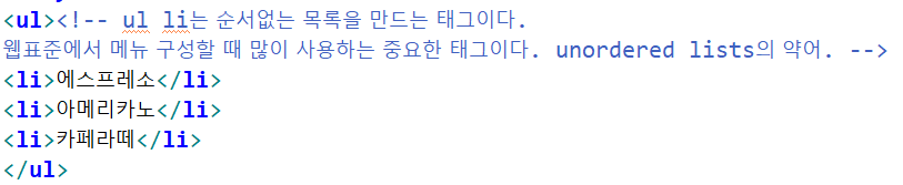 ul태그는 부모태그, li태그는 자식태그로 부모는 반드시 자식을, 자식은 반드시 부모태그를 갖고있다. 여기서 ul li태그는 순서없는 목록을 만드는 태그이다. ul은 unordered list의 약어이다.