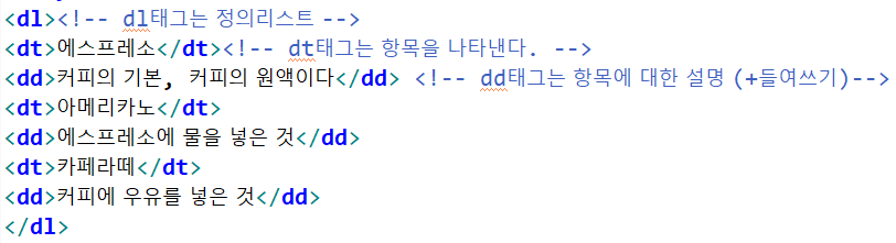 dl태그는 정의리스트, dt태그는 항목, dd는 항목에 대한 설명할 때 사용하는 태그이다.