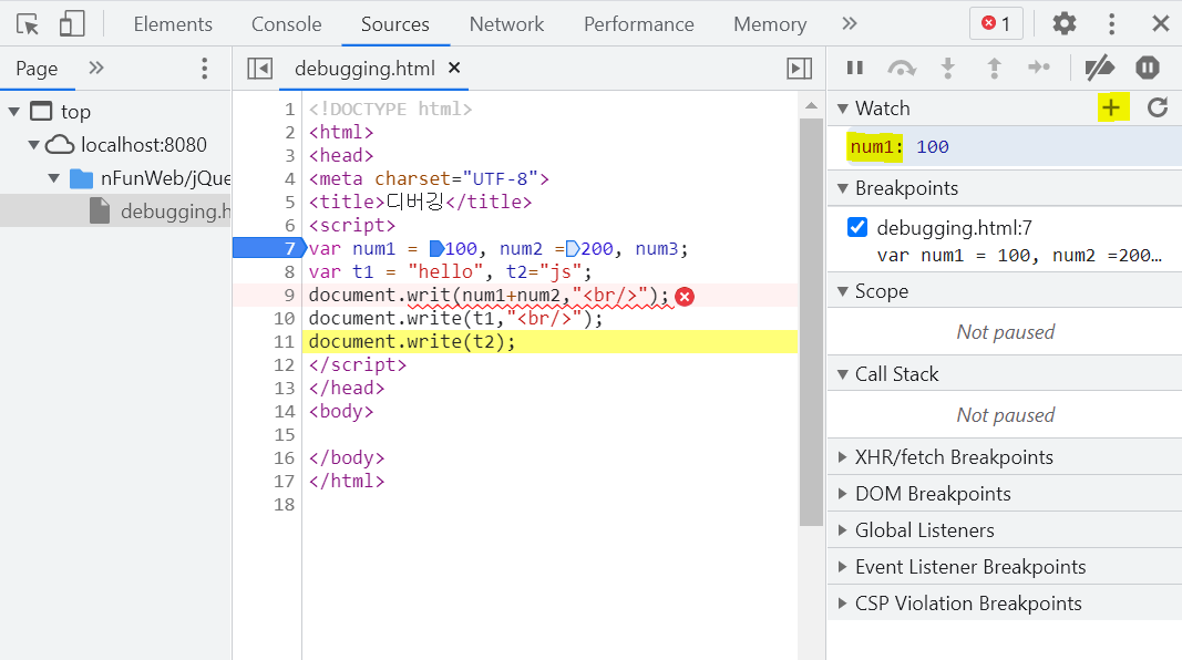 파일을 실행한 후, 소스 패널에서 중단점을 등록한 다음 Watch탭에서 +버튼을 눌러 변수를 등록한다.