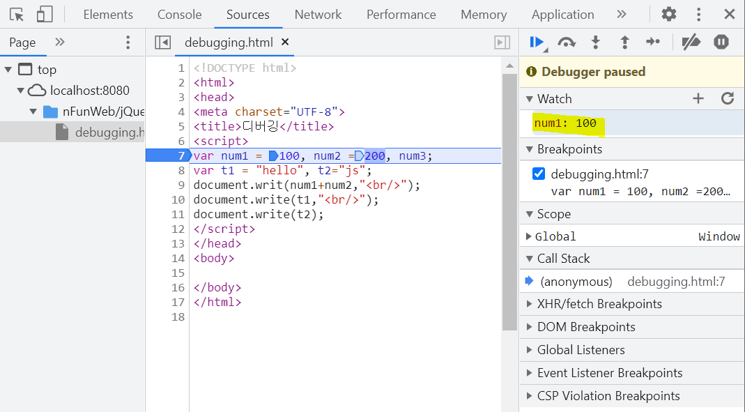 그 후 F5를 눌러 새로고침한 후 F11키를 누르면서 Watch에 등록된 변수를 관찰할 수 있다.