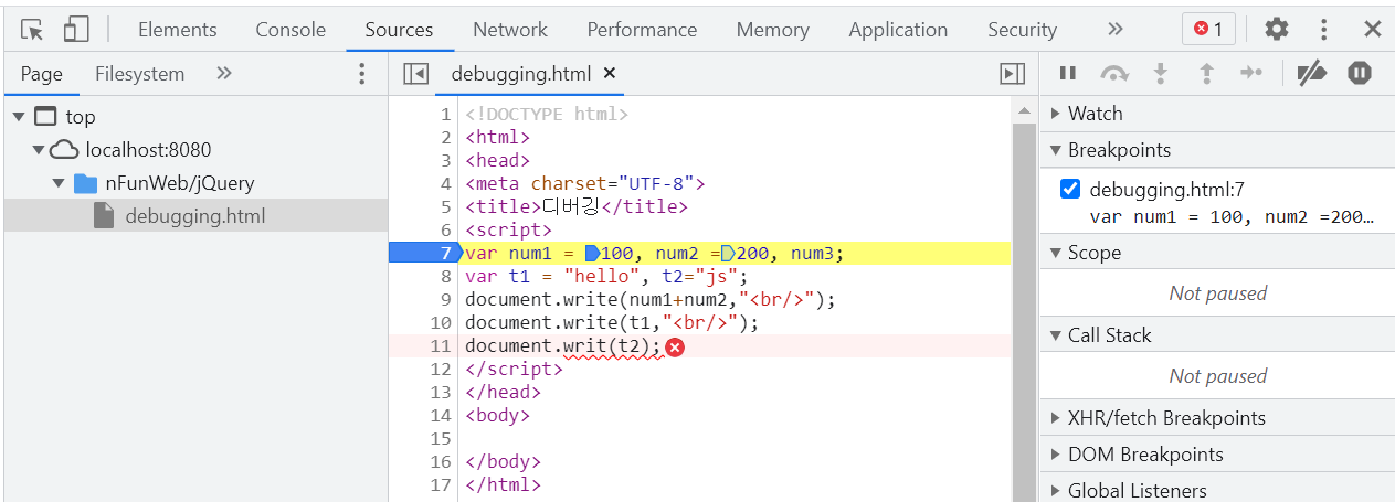 앞에서의 오류를 다시 이용해서 이번에는 Sources패널을 클릭한다. 그리고 현재 실행한 HTML파일을 찾아 선택하면 개발자도구의 오른쪽 창에 코드가 나타난다. 이 때 새로고침 버튼을 누르면 오류표시가 나타난다. 즉 해당 위치에서 오류가 발생한 것으로 이렇게 소스 패널을 활용하면 오류를 쉽게 수정할 수 있다.