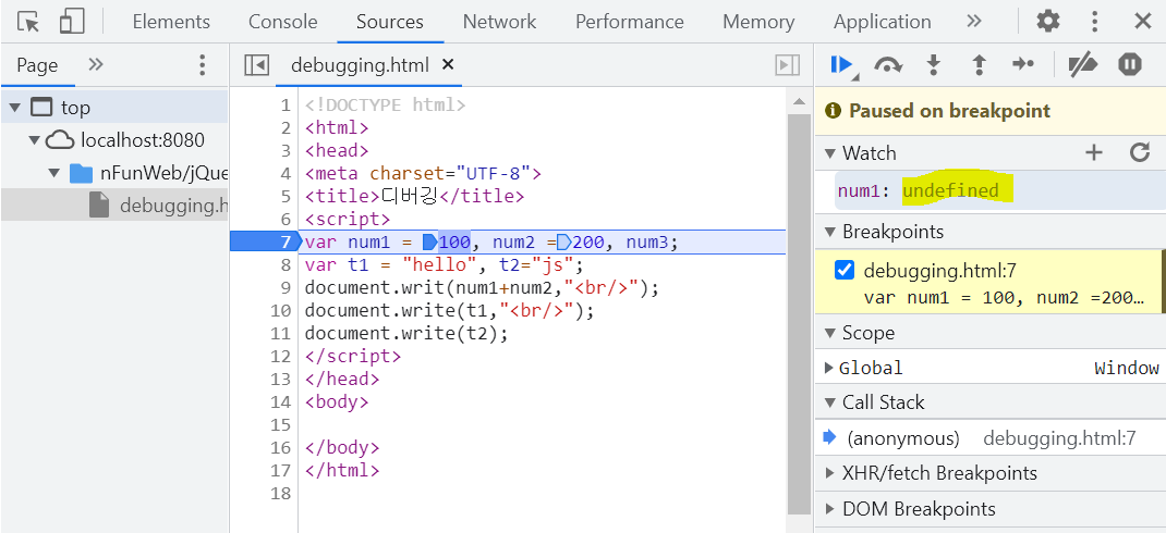 그 후 F5를 눌러 새로고침한 후 F11키를 누르면서 Watch에 등록된 변수를 관찰할 수 있다.