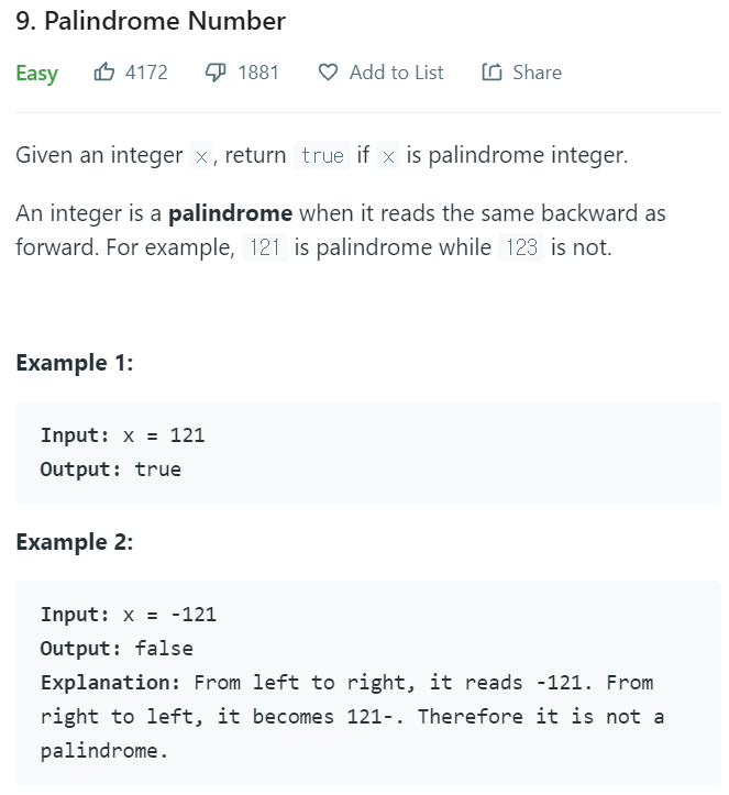 반복문 안에서는 num의 값을 반대로 저장한 reverse의 값을 저장하며, return에서 reverse == x로 비교해 같으면 true, 다르면 false가 반환되게 만든다.