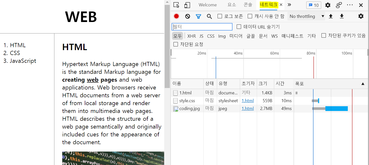 화면 오른쪽 클릭- 검사-네트워크탭 에서 1.html 파일을 리로드했을 때 내부적으로 어떤 파일들을 웹서버에서 다운로드를 받는지 볼 수 있다.