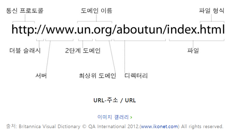 - URL (Uniform resource locator) : 웹 문서의 각종 서비스를 제공하는 서버들에 있는 파일의 위치를 표시하는 표준. 기본적으로 "통신 규칙://인터넷 호스트 주소/경로이름"으로 구성된다.
