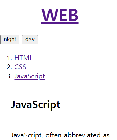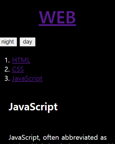 코드를 완성하면 "night"버튼을 누르면 <body>태그의 백그라운드색=검정, 글자색=하양으로 바꿔준다.