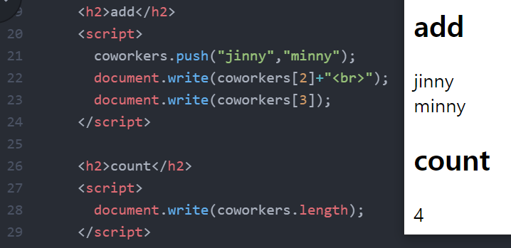 coworkers 배열에 coworker.push로 두 사람을 더 추가하니 length의 값이 4로 된 것을 확인할 수 있다.