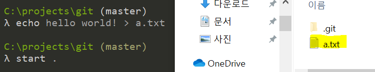 그리고 스크린샷을 보면 echo 명령어 입력하기 전에는 (master) 브랜치가 하얀색이었는데 주황색으로 색이 변경된 것을 확인할 수 있는데 이것은 워킹 디렉토리에 아직 커밋되지 않은 변경사항이 생겼다는 것을 알려준다.
