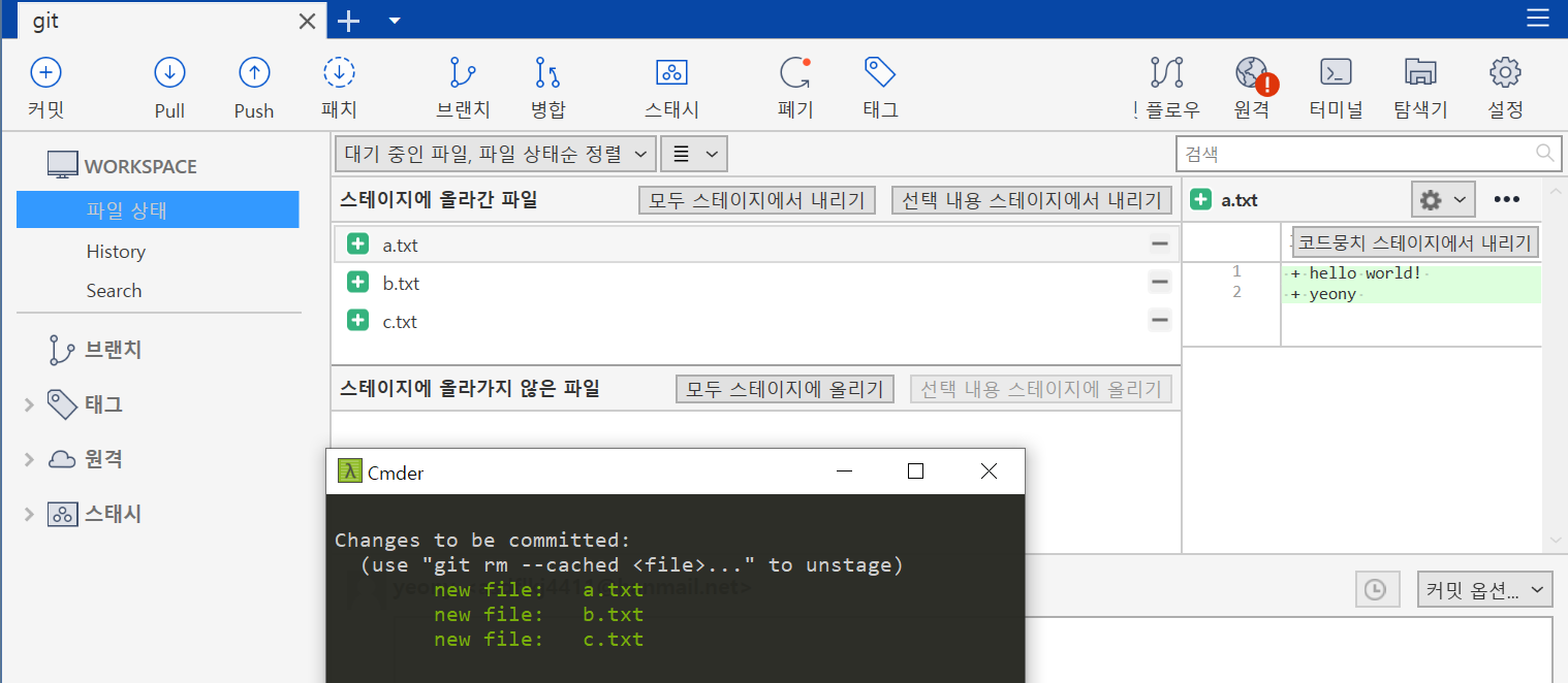 스테이징 에리어에는 abc파일(hello world!)이 있고, 워킹디렉토리 tracked-modifed로 a파일(hellow world! yeony)이 있는 것이다. 여기서 "git add a.txt"를 입력하고 깃 상태를 확인하면 abc파일들이 다 스테이징 에리어에 옮겨진 것을 확인해 볼 수 있다.