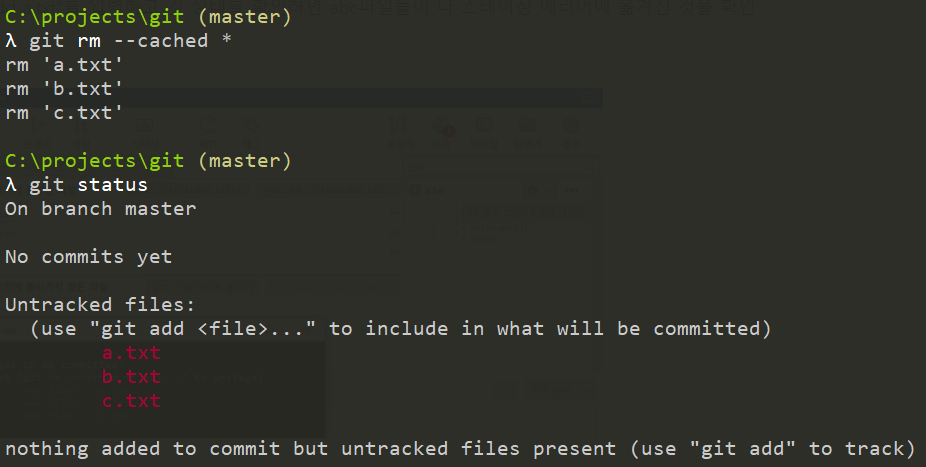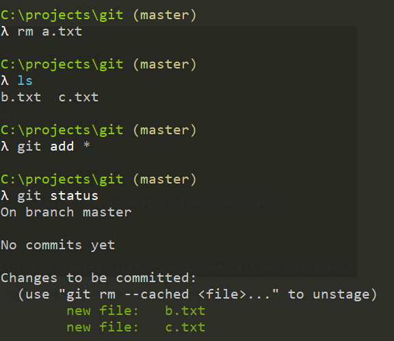만약에 a.txt를 "rm a.txt"로 제거하고 "git add *"명령어를 입력하면, 삭제된 a파일은 디렉토리에 없었기 때문에 깃 스테이징 에리어에 추가되지 않는다.