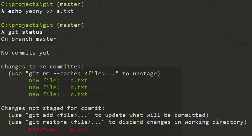 여기서 새로운 문자열인 yeony를 "echo yeony >> a.txt" 명령어로 다시 a.txt파일에 추가하고 다시 상태를 확인하면, 총 3가지 파일은 커밋할 준비가 되어있는데, a.txt 파일이 수정 되어져 있는것을 확인할 수 있다.
