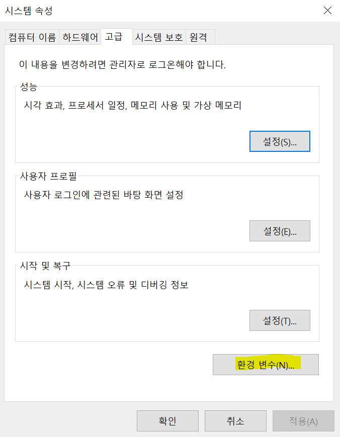 그리고 제어판을 열어 "제어판-시스템-고급 시스템 설정 -환경변수-편집-새로만들기"로 들어가서 복사한 경로를 붙여넣어 추가해준다.