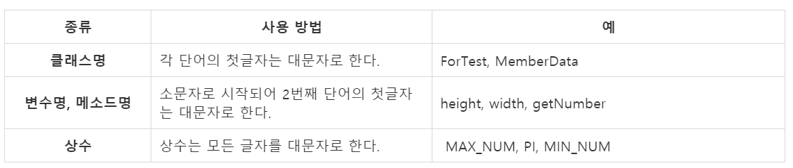 프로그래머가 특별히 의미를 부여하는 단어로 변수의 이름이나 메소드의 이름 등을 식별자라고 한다.