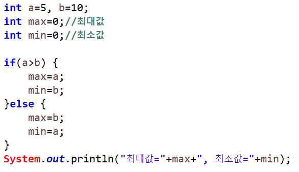 위의 예제를 보면,  if문의 조건이 a>b, 여기서 a=5, b=10로 거짓이므로 if문이 아닌 else문이 실행되어 max=b, min=a로 대입된다. 그래서 최대값=10, 최소값=5가 출력된다.
