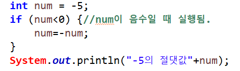 위의 예제를 보면, if문의 조건이 num<0이므로, num의 값이 -5이므로 if문을 실행하게 된다. 그래서 num=5가 된다. 만약에 num이 num<0가 아니라면, if문을 무시하고 num값이 바로 출력된다.