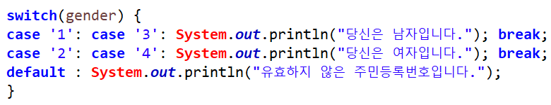 위의 예제를 보면, char형 변수 gender 값이 '1', '2'일 때는 남자라는 내용이 출력, 값이 '3', '4'일 때는 여자라는 내용이 출력되며 case문 값과 일치하지 않으면 default 문장의 유효하지 않는다는 내용이 출력된다. 여기서 break문이 있기 때문에 '1','2'값이 들어가면 남자라는 내용만 출력된다.