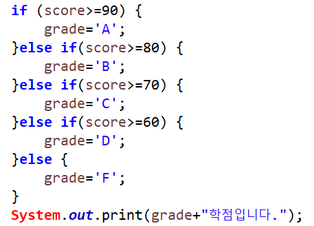 여기서 (80 <= score && score < 90 : 80점 이상 90점 미만)조건이 아닌 (score>=80 :80점 이상)만 준 이유는 위의 if문 조건인 (score>=90:90점 이상)에서 걸러지기 때문이다.