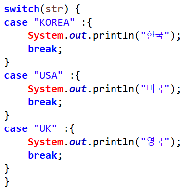 위의 예제를 보면, String형 변수 str 값이 "KOREA"일 때는 한국이라는 내용이 출력되며 각각의 케이스에 따라서 해당 문장들이 출력된다. 이 switch문에도 default문이 없는데 case값과 일치하지 않으면 아무런 문장도 실행되지 않는다.
