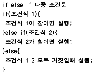 if-else if문의 구조는 위와 같으며, 처리해야 할 경우가 많을 때 사용된다. if와 else문 사이에 else if문을 작성하며, else if문은 여러번 작성할 수 있다. 하나의 조건식을 만족하면 해당 문장을 실행하고 if-else if문을 빠져나온다.