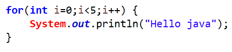 위의 예제를 보면, for문에서 i=0으로 선언 및 초기화를 하며, 조건식이 i<5로 i가 0~4일 때까지 총 5번 반복하게된다. 출력 결과로는 "Hello java"라는 문장이 5번 출력된다.