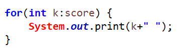 위의 예제를 보면, k변수를 선언하고, score 배열에 대한 원소값을 출력하는 확장 for문이다. 또는 sum변수를 선언하고, sum+=k; 문장을 추가해 score변수의 원소값의 누적합들도 구할 수 있다.