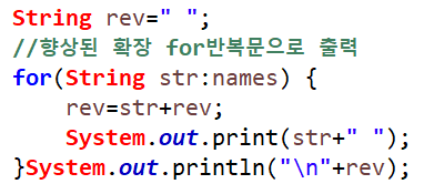 위의 예제를 보면, str변수를 선언하고, names 배열에 대한 원소값을 출력하는 확장 for문이다. 추가로 rev변수를 선언해서 rev=str+rev;문장으로 원소값들을 거꾸로 출력되게 할 수 있다. print(str+" ");에서 배열 원소값 그대로 "김 Park Yi"가 출력되며, println("\n"+rev);에서는 배열 원소값이 거꾸로 출력되어 "YiPark김"이 출력된다.