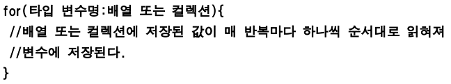 확장 for문은 JDK 1.5이상 부터 배열과 컬렉션에 저장된 요소에 기존 for문 보다 접근하기 편리한 방법으로 처리할 수 있도록 새롭게 추가되었다.