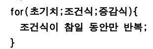 for문의 구조는 위와 같으며, 조건식이 참인동안 괄호 안의 문장들을 반복하다 거짓이 되면 반복문을 벗어난다. 처음엔 초기값(변수에 최초의 값을 저장)을 실행하며, 조건식에 참일 동안 괄호 안에 문장을 반복 실행한다.