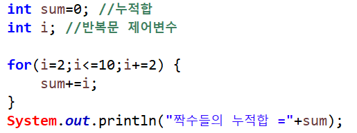 위의 예제를 보면, for문에서 i=2로 선언 및 초기화를 하며, 조건식이 i<=10으로 i가 2~10일 때까지 총 5번 반복하게된다. (왜냐하면 증감식에서 i가 2씩 증가되므로 i=2, 4, 6, 8, 10이 된다.) 출력 결과로는 변수 sum에 i의 값이 계속 더해지면서 2+4+6+8+10으로 "짝수들의 누적합 =30"이 출력된다.