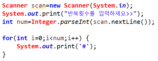 위의 예제를 보면, 일단 Scanner 클래스에서 반복횟수를 입력 받으며, 이 반복횟수는 변수 num에 대입된다. 아래 for문에서는 i=0으로 선언 및 초기화를 하며, i<num으로 아까 입력받은 반복횟수 미만으로 만약 num=5가되면 i는 0,1,2,3,4로 총 5번 아래 문장이 실행되어 "#####"가 출력된다.
