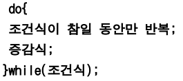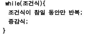 while문의 구조는 위와 같으며, 조건식이 참일동안 아래의 문장이 반복된다. if문과 구조는 같지만, while문은 조건식이 참일동안 반복된다는 점이 다르다. 조건식이 거짓이면 문장 전체를 벗어난다. while문에서 초기치와 증감식만 추가되면 for문과 동일하게 사용이 가능하다.