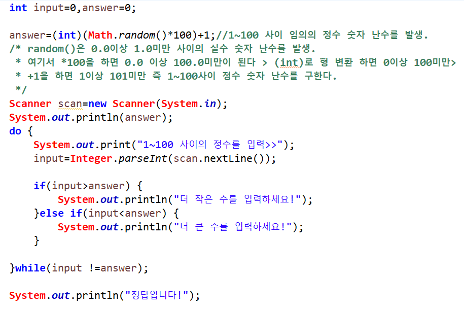 위의 예제를 보면, 이상적인 do~while문 예제이다. answer변수에 임의의 정수값이 대입되며, do의 문장을 한번 실행한다. 스캐너 클래스로 input변수 값을 입력받아 input값이 answer값과 같지 않으면 if-elseif문에 걸리며 값이 같아질 때 까지 do문장을 계속 반복하며, 값이 같으면 while 조건문에 거짓으로 "정답입니다!"가 출력된다.