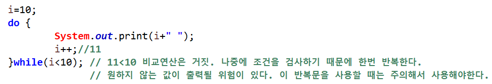 위의 예제를 보면, 일단 do의 문장을 한번 실행한다. 그리고 while의 조건식 i<10와 비교해서 참일동안 do문장을 실행하지만 여기서 i는 10이므로 거짓으로 문장을 빠져나와 출력되는 값은 "10"이 된다.