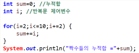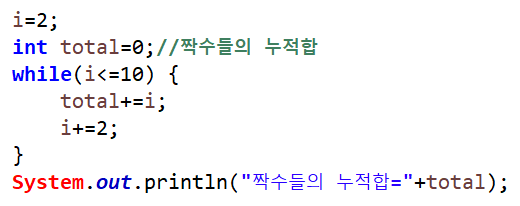 위의 예제를 보면, while문에서 조건식 i<=10일동안 total에 i값을 계속 더한다. i가 2씩 증가되기 때문에 i가 2, 4, 6, 8, 10일 때만 while문장이 실행되어 "짝수들의 누적합=30"이 출력된다.