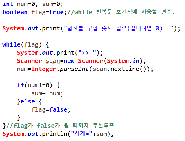 위의 예제를 보면, flag=true이므로 while문은 무한루프 문이다. 여기서 변수 num에 숫자를 입력 받아 0이 아니면 계속 더하며 0이면 flag=false가 되어 무한루프를 빠져나온다.