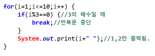 위의 예제를 보면, for문은 i가 1~10일 동안 괄호 안의 문장이 반복되는데, if문 조건에서 i를 3으로 나눴을 때 나머지가 0(3의배수)이 되면 break문을 만나 for문을 벗어나게 되므로 출력되는 값은 1,2 이다.