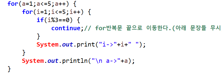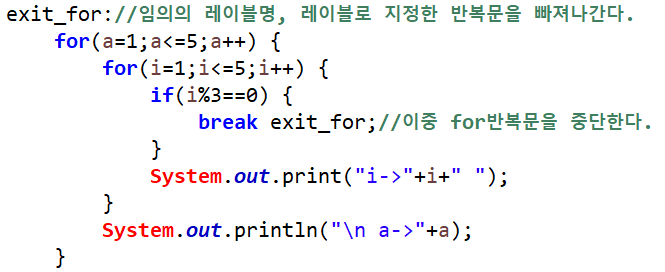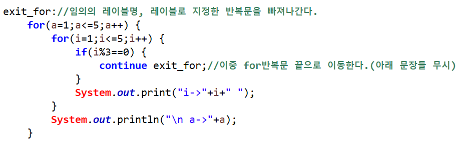 만약에 continue문+레이블 예제에서 continue;라고만 하면 안쪽 for문 끝으로 이동하기 때문에 i->1 i->2 i->4 i->5 a->1 ~ i->1 i->2 i->4 i->5 a->5까지 출력되게 된다.