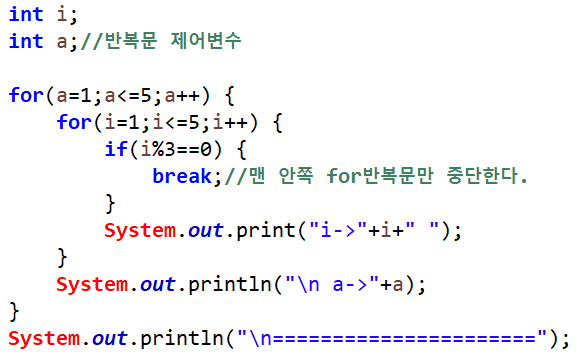 switch문에서 자주 쓰는 break문은 다른 반복문에서도 사용되며, 반복문 내에서 break문을 만나면 break문이 포함된 가장 가까운 반복문을 벗어난다.