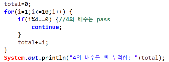 위의 예제를 보면, for문은 i가 1~10까지 반복되며, if문 조건으로 i가 4의 배수일 때 continue문을 만나 아래의 total+=i;문장은 실행되지 않고 다시 반복되어 총 출력되는 값은 "4의 배수를 뺀 누적합 : 43"이 출력된다. 만약 break문이었다면 i가 1~3일 때만 반복되어 1+2+3인 6이 출력된다.