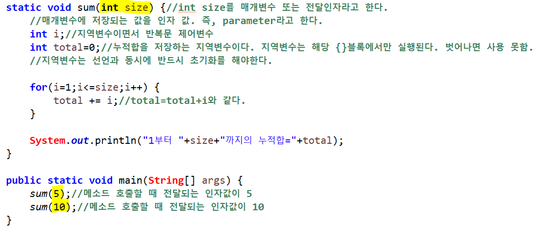 ex) 메소드 이름(값1, 값2, ..) //메소드 호출 방법.