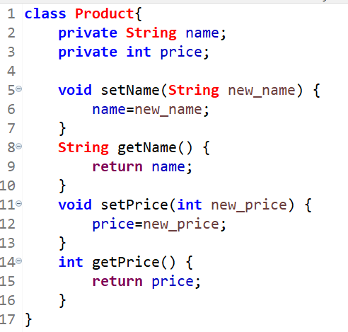 Product클래스에서 멤버 변수들을 private로 선언했다. 해당 접근 제어자는 클래스 내에서만 사용이 가능하므로, setName()메소드와 setPrice()메소드로 이름과 가격을 매개변수로 받아 대입하고, getName()메소드와 getPrice()메소드로 이름과 가격을 리턴받아 사용이 가능하다. private를 사용하는 용도는 보안성 때문이다.