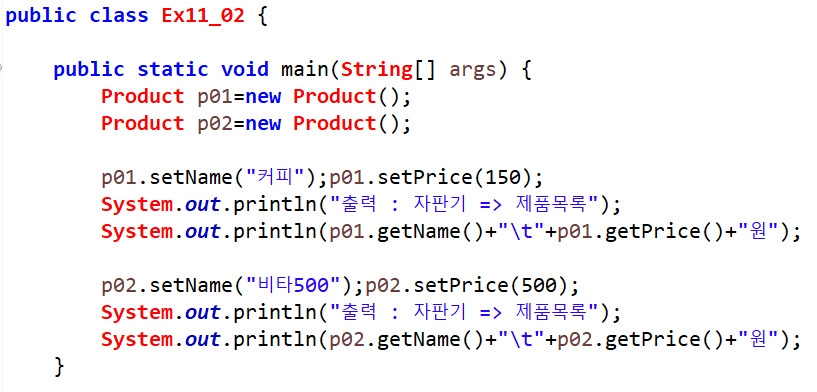 각각 p01과 p02객체를 생성해 setName()메소드와 setPrice()메소드로 이름과 가격을 대입하고 getName()메소드와 getPrice()메소드로이름과 가격을 출력 받는다.