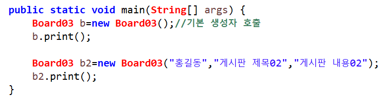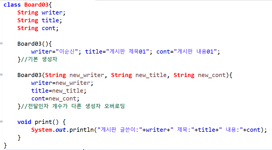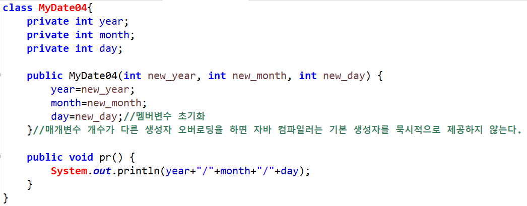 생성자도 오버로딩이 가능하다. 하지만 주의해야할 점이 있는데, 오버로딩 된 경우는 기본 생성자를 제공하지 않기 때문에 기본 생성자를 명시적인 코드를 하는 습관을 가지는 경우가 좋다.