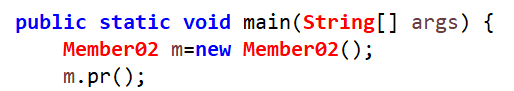 Member02 m=new Member02();로 m 인스턴스 생성 및 Member02()에 의해 생성자 호출로 멤버변수가 초기화 된다. 그 후 m.pr()로 pr()메소드를 호출하면 생성자에서 초기화된 값이 호출된다.
